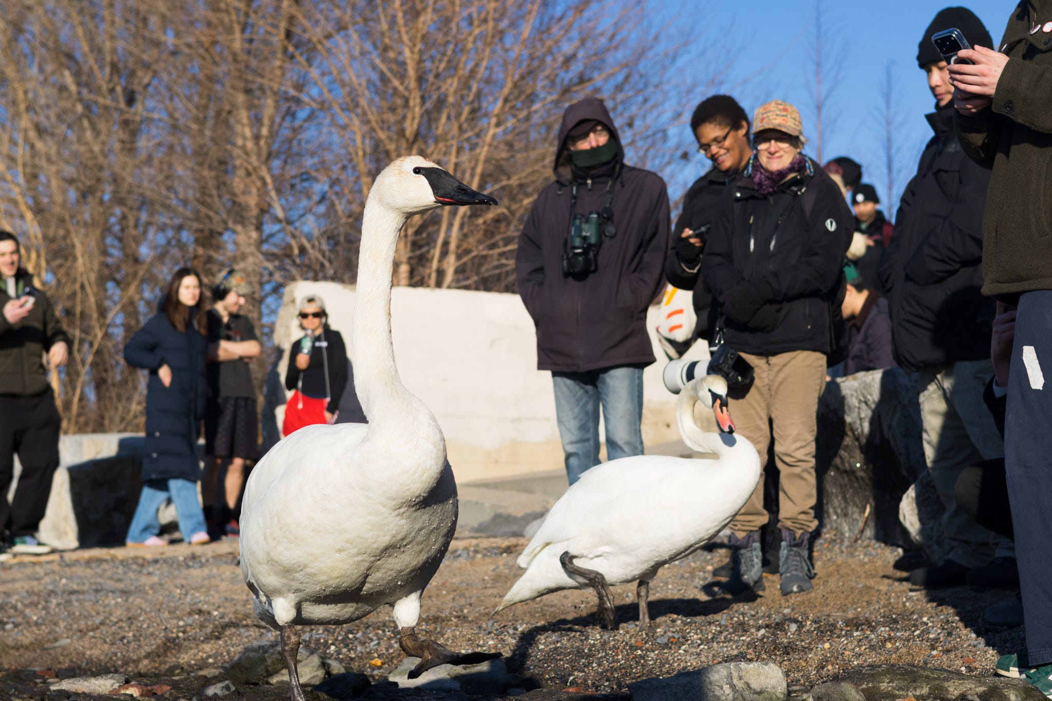 I joined many other admirers in paying the swans a visit that first weekend. A crowd of a couple dozen, about half of them birders, gathered on the gravel beach of Marsha P. Johnson State Park as the pair sauntered out of the water. They stood amid the crowd, evidently expecting to be fed.
