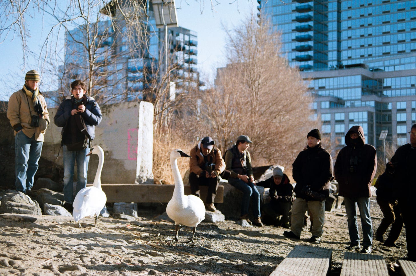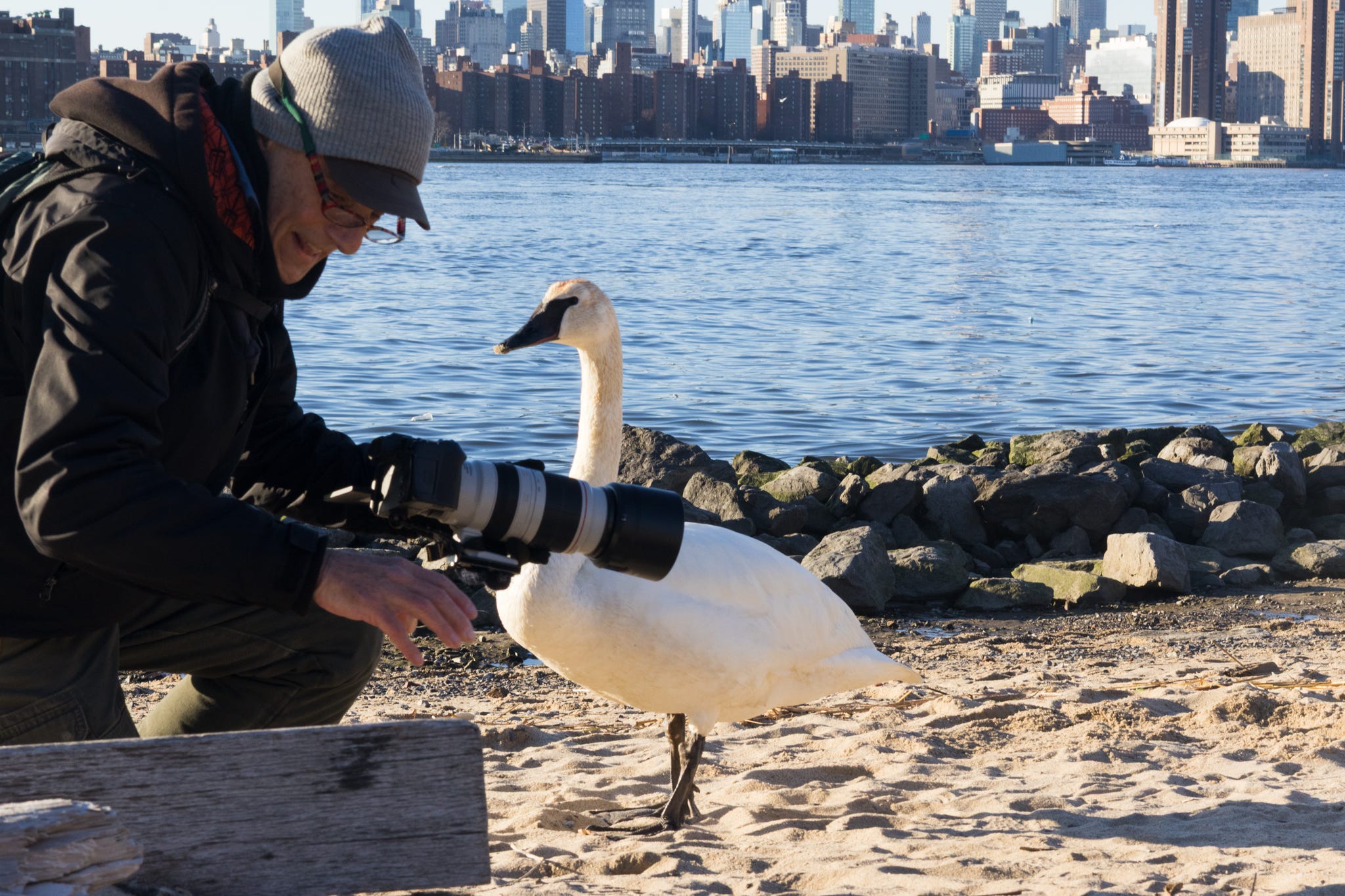 Falling in with a local helped this Trumpeter acclimate to urban life. Swans are social, looking to each other for behavioral cues; this duo took to begging for food as if the Williamsburg waterfront were an upscale duck pond. When the Trumpeter appeared at the end of February, several observers in birdwatching groups online marveled at it snacking on pizza.